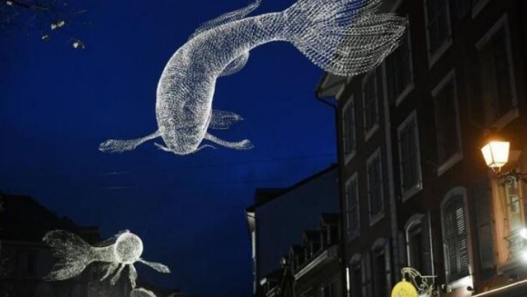 Cette année, des biches et des ours se sont invités pour la première fois, dans le traditionnel décor d’illuminations. Sur le toit de la bibliothèque , la Biche de l’artiste Cédric Le Borgne veille, tandis que ses Oiseaux reprennent leur place près de la fontaine des Tours et aux Noirettes.