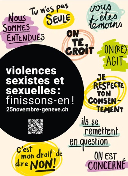 A Genève, le Canton, la Ville et un large réseau d’associations, de collectivités publiques et d’institutions s’engagent toute l’année pour sensibiliser le grand public, former les différents corps professionnels et accompagner les victimes de violences. En novembre, ces partenaires organisent conjointement une campagne, avec de l’affichage dans l’espace public et une programmation événementielle pour appeler à une mobilisation collective contre les violences sexistes et sexuelles. En parallèle des événements de novembre, ce site internet se veut être une “boîte à outils” mettant en lumière le réseau et les ressources locales d’aide et d’information en tout temps – afin que chaque personne se sente concernée, légitime et équipée pour lutter contre ces violences et soutenir la promotion des droits des femmes et des minorités de genre.